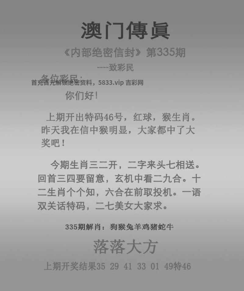 335期:今期生肖三二开,二字来头七相送。回首三四要留意,玄机中看二九合。十二生肖个个知,六合在前取投机。一语双关话特码,二七美女大家求。 |