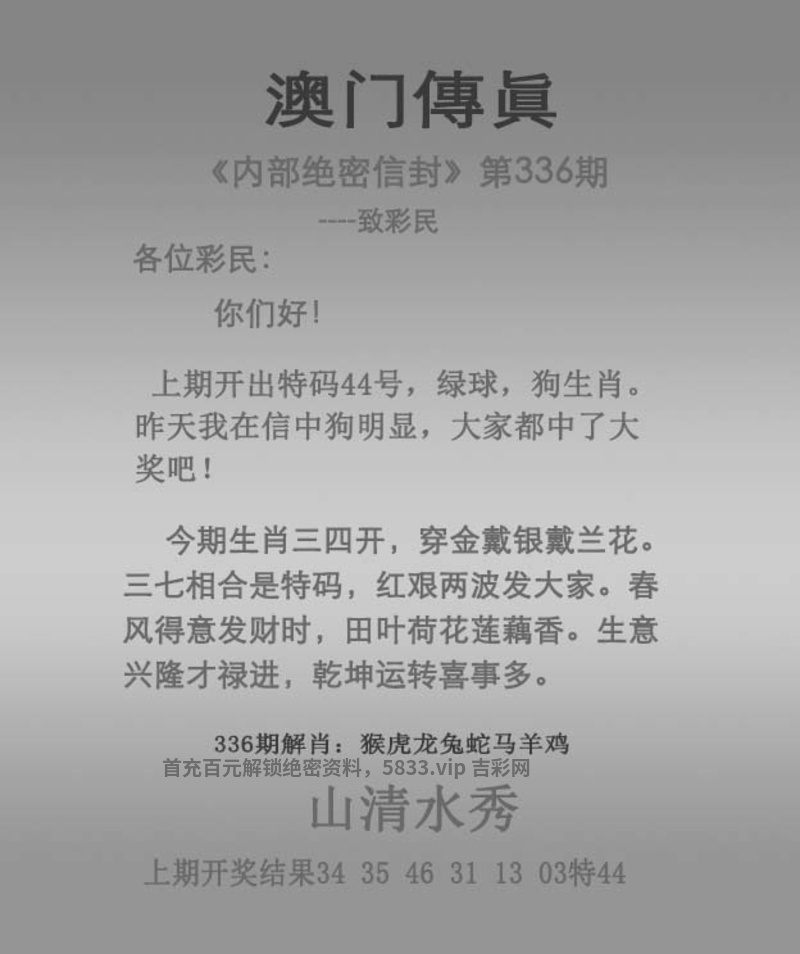 336期:今期生肖三四开,穿金戴银戴兰花。三七相合是特码,红艰两波发大家。春风得意发财时,田叶荷花莲藕香。生意兴隆才禄进,乾坤运转喜事多。 |